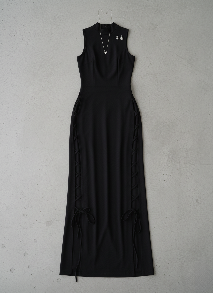 Turn up the heat with this ultra-sleek bodycon dress. Designed with a high neckline, bold side cut-outs, and criss-cross lace detailing, it sculpts your shape while keeping the look modern and minimal. Made from smooth, stretchy fabric for a flawless, confident fit—perfect for nights out, events, or anytime you want all eyes on you.