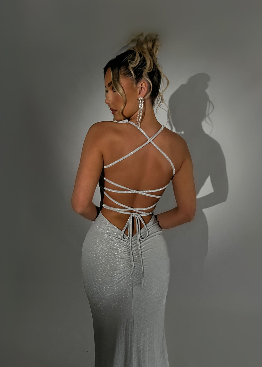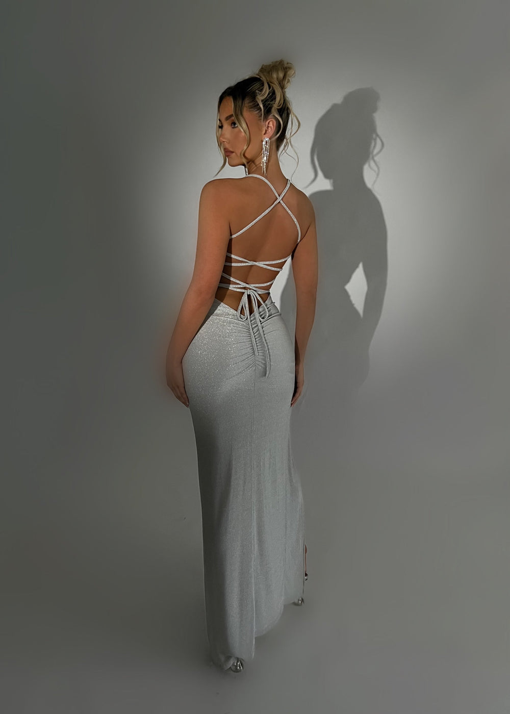 Dazzle all night long in our Just Tonight Lurex Maxi Dress! Made from stunning lurex fabric, this elegant dress features a front leg slit for added allure. The back tie details add a touch of sophistication, making this the perfect dress for a special evening out.