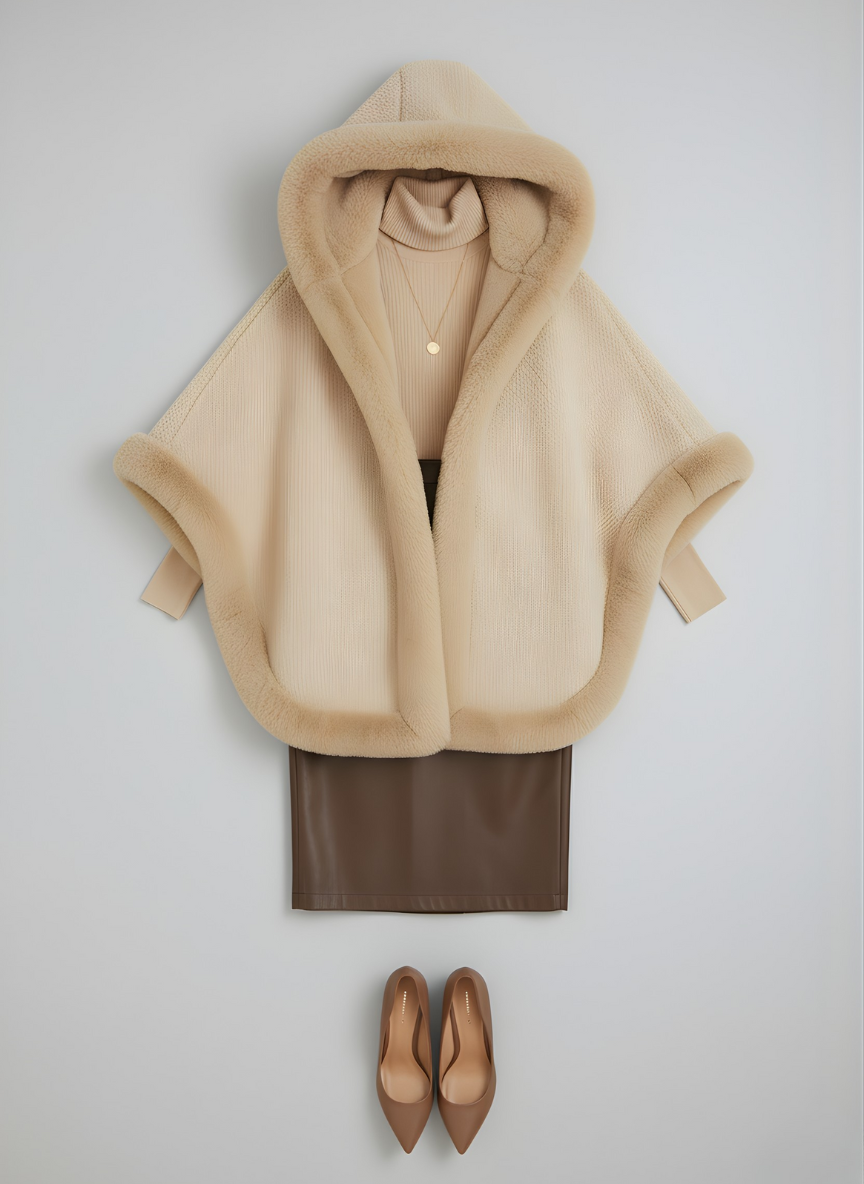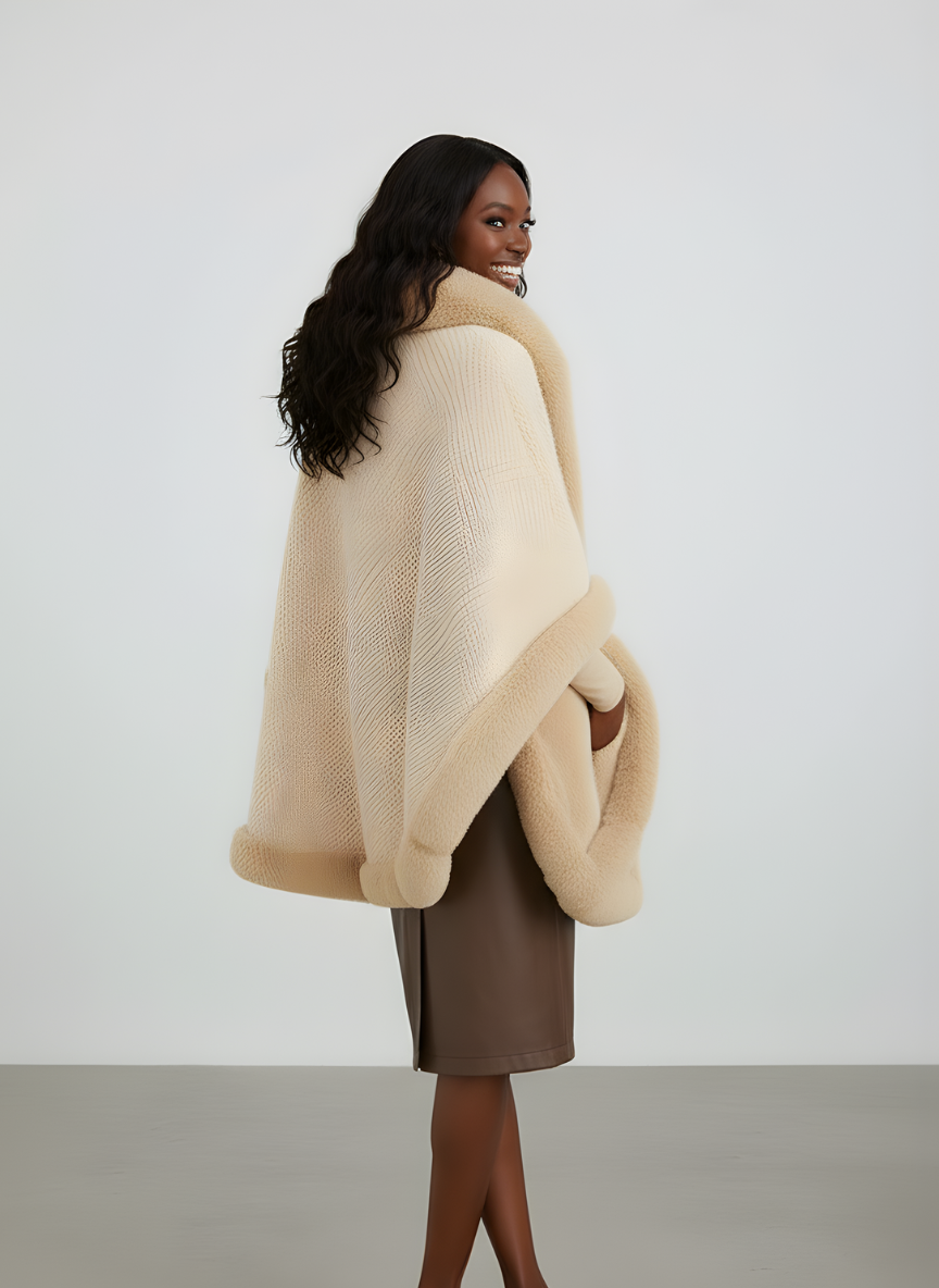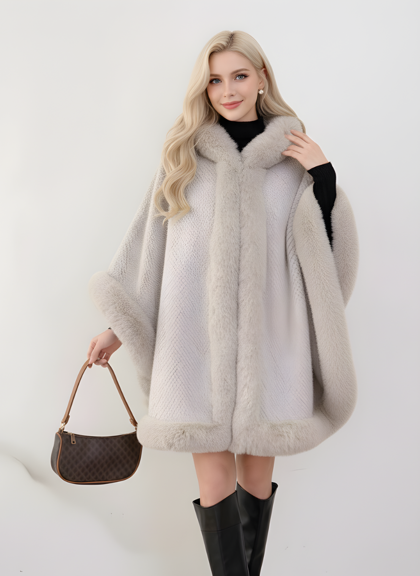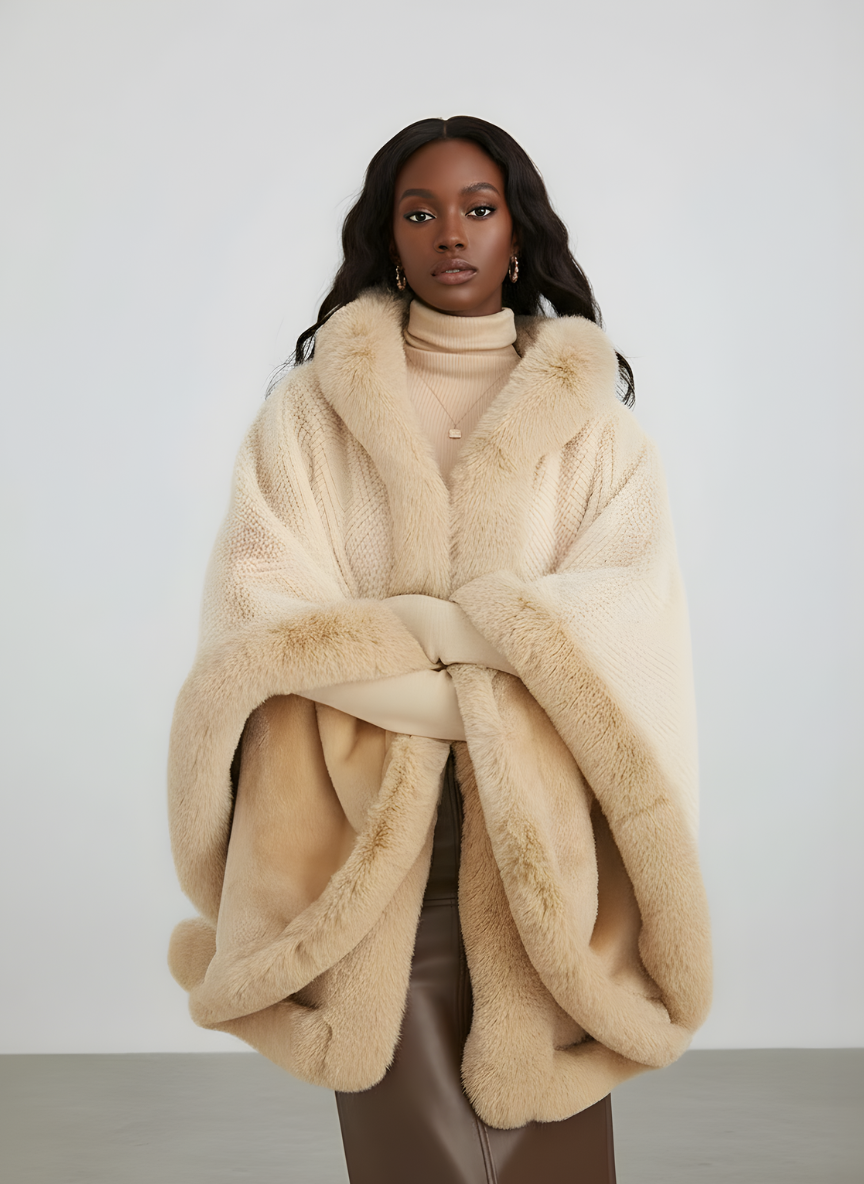 This faux fur-trimmed cape coat combines cozy comfort with timeless elegance — designed to elevate any winter look. The soft acrylic wool blend drapes beautifully, while the plush faux fur trim adds a touch of sophistication. Perfect for layering over knitwear or dresses for an effortlessly chic finish.