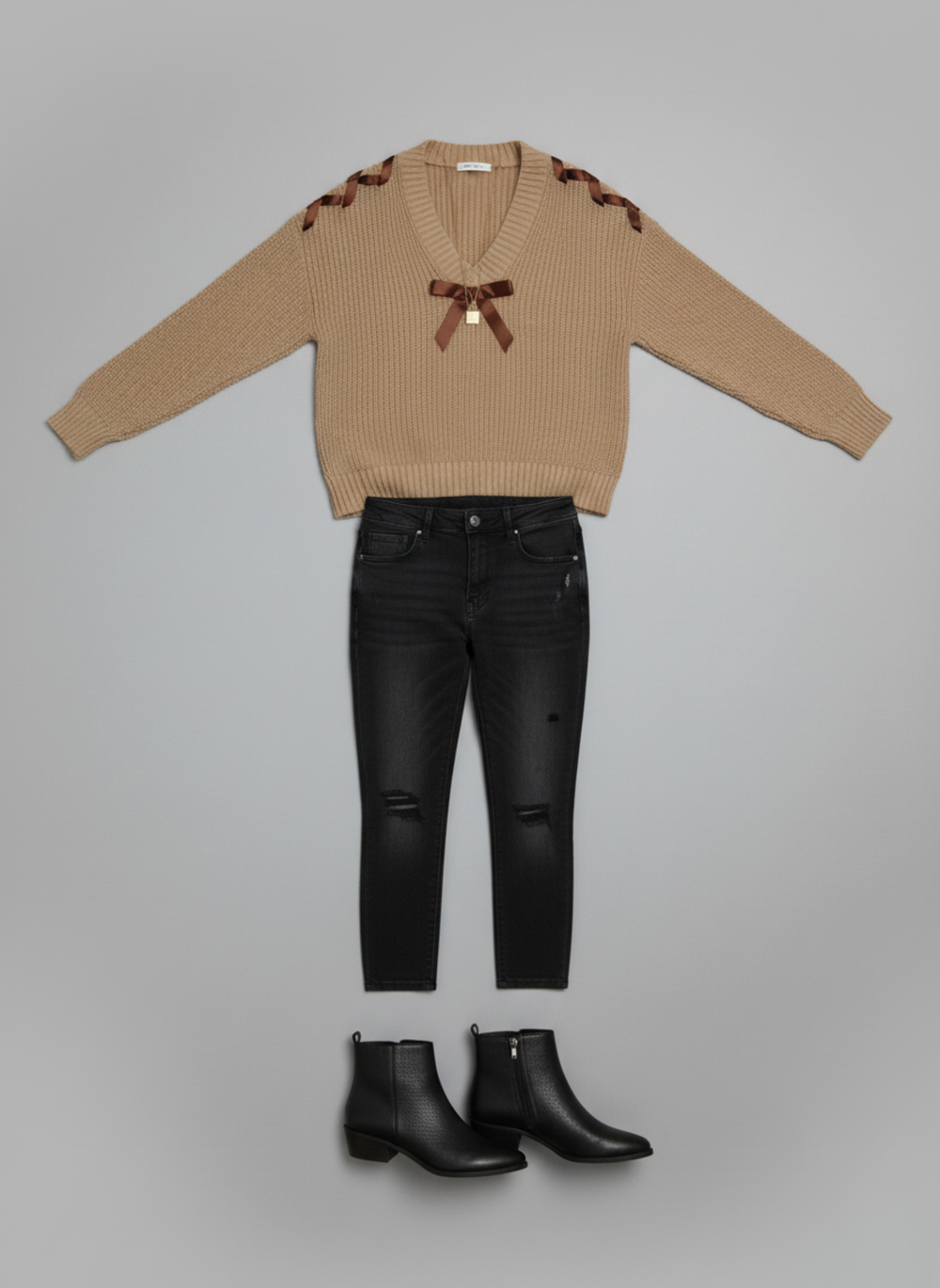 Soft, warm, and effortlessly chic — this Ribbon Detail Knit Sweater blends feminine charm with a modern minimalist edge. The relaxed silhouette and delicate satin lace-up neckline create a subtle statement piece perfect for cooler days.