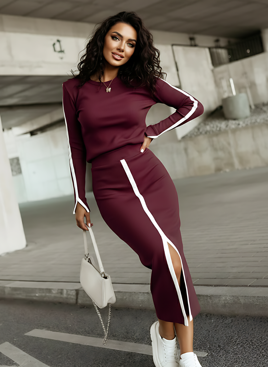 Modern Silhouette – Relaxed top paired with a feminine midi skirt for effortless balance.